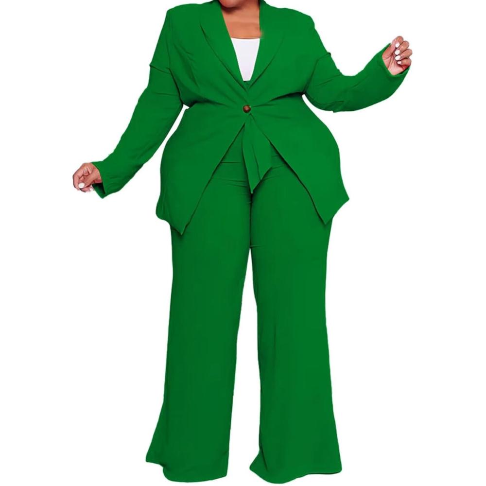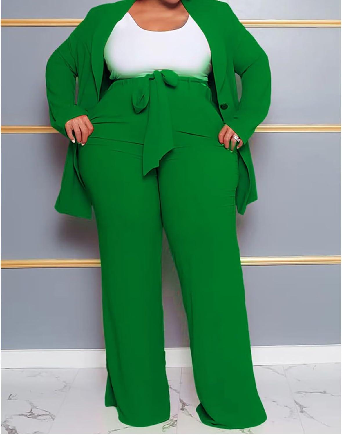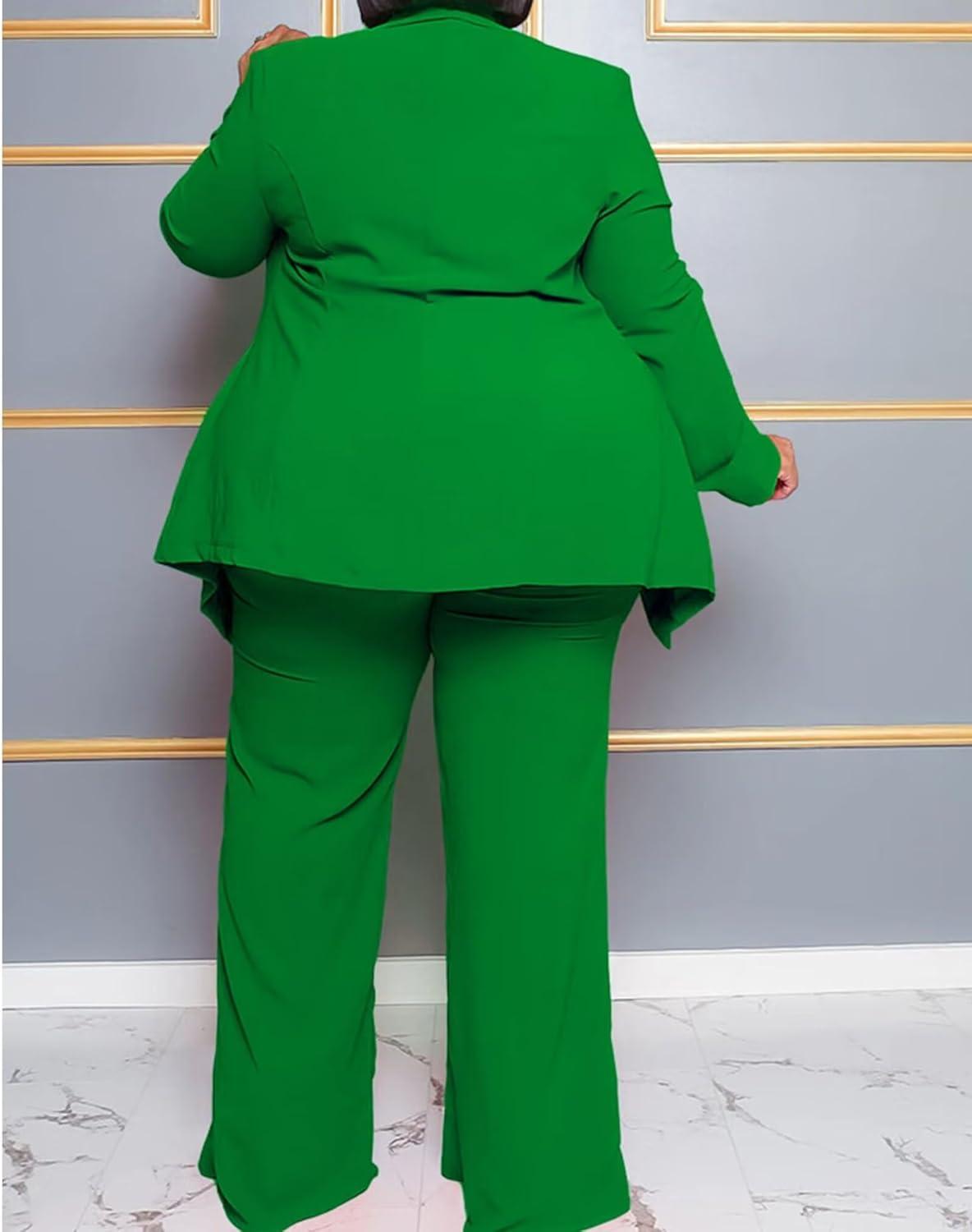 IyMoo Plus Size Suits for Women Business Open Front Long Sleeve Blazer Elastic Waist Solid Straight Leg Pant Set Suits(Green)