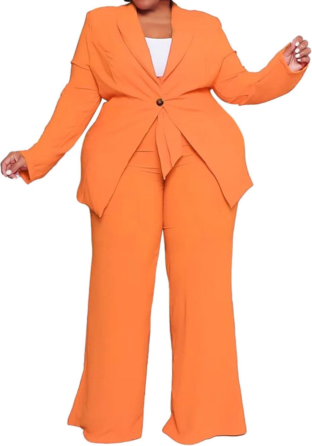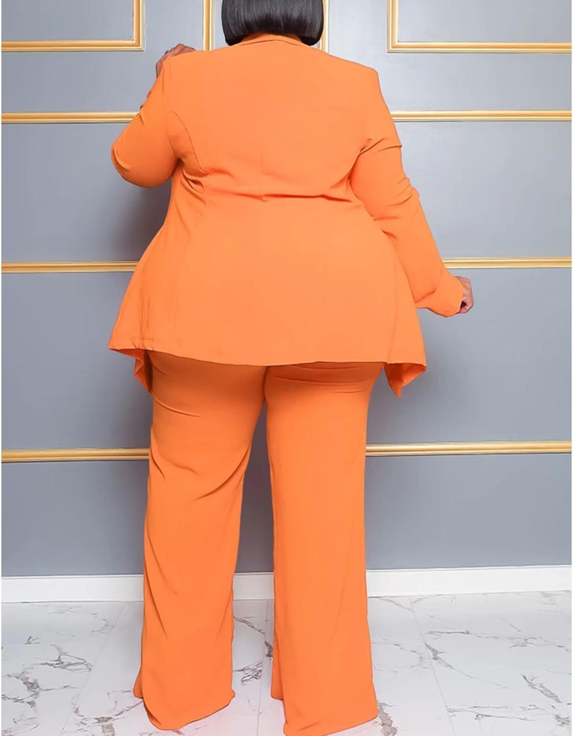 IyMoo Plus Size Suits for Women Business Open Front Long Sleeve Blazer Elastic Waist Solid Straight Leg Pant Set Suits(Orange)
