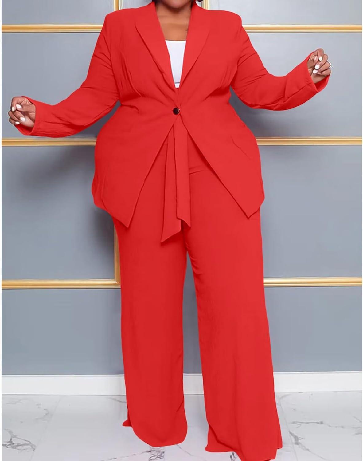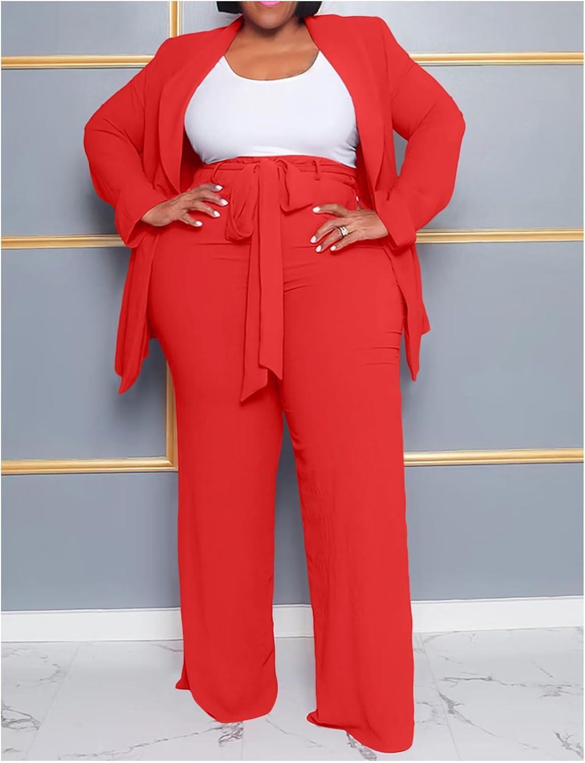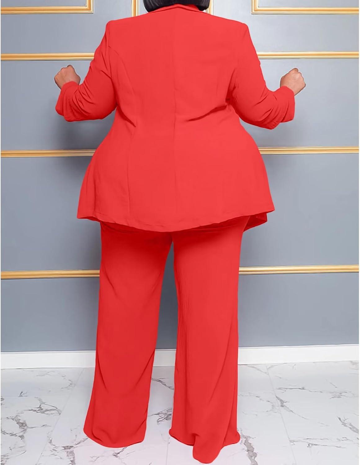IyMoo Plus Size Suits for Women Business Open Front Long Sleeve Blazer Elastic Waist Solid Straight Leg Pant Set Suits(Red)
