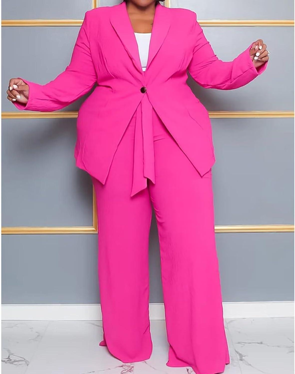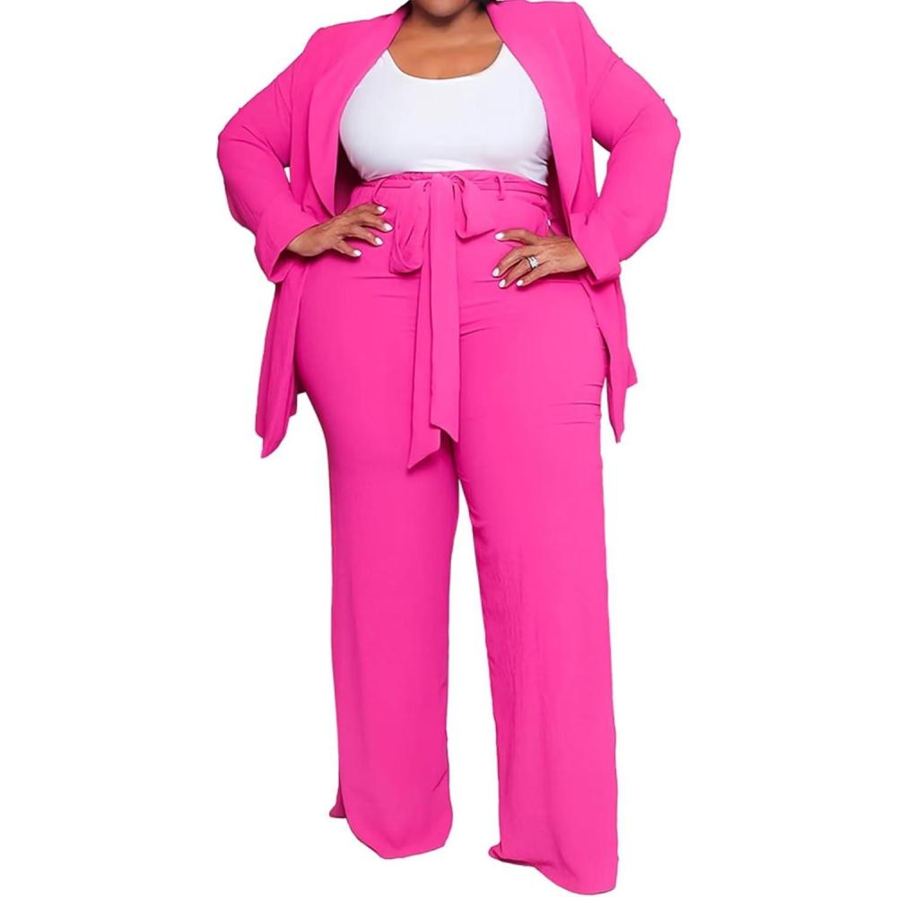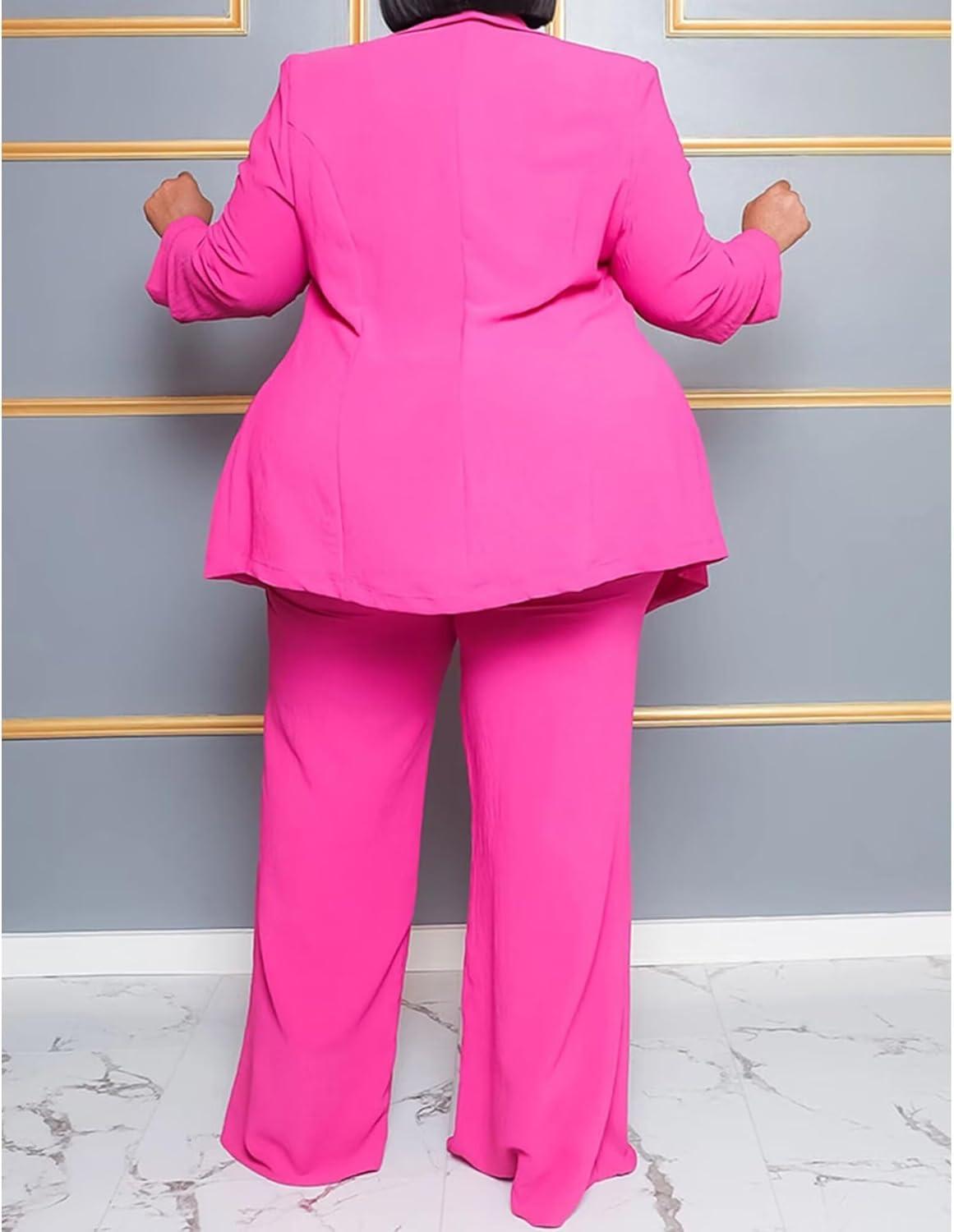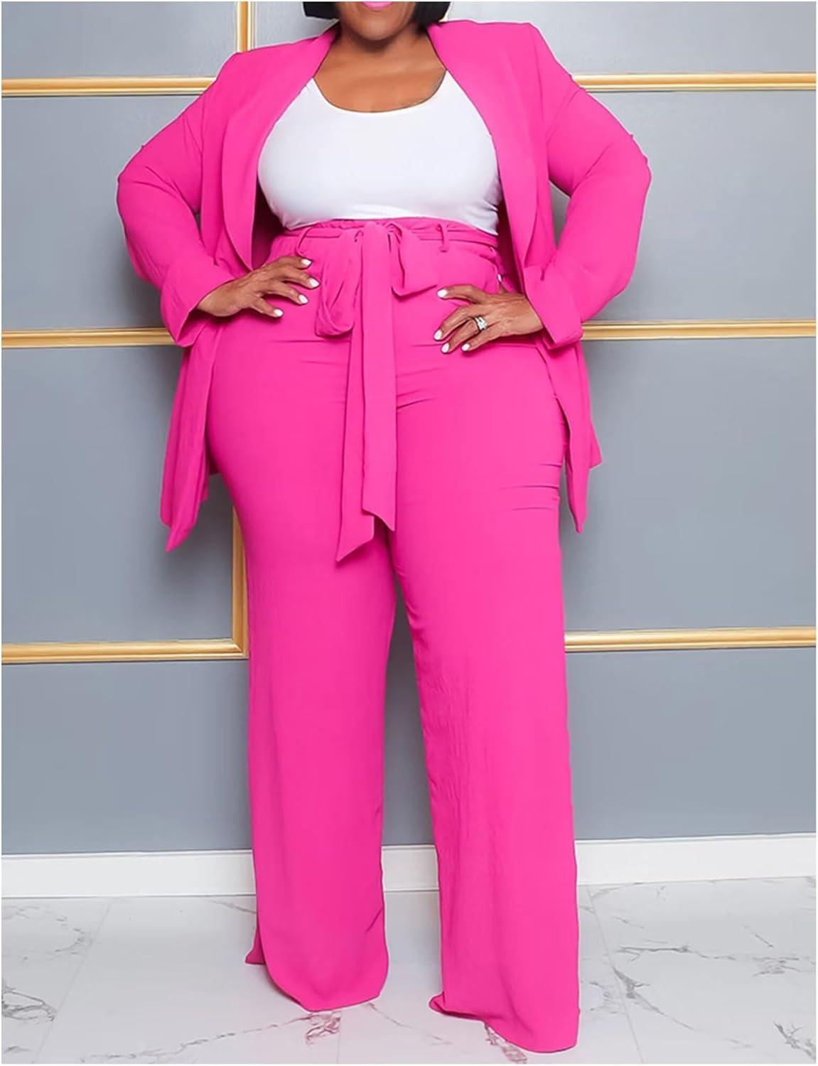 IyMoo Plus Size Suits for Women Business Open Front Long Sleeve Blazer Elastic Waist Solid Straight Leg Pant Set Suits(Rose Red)