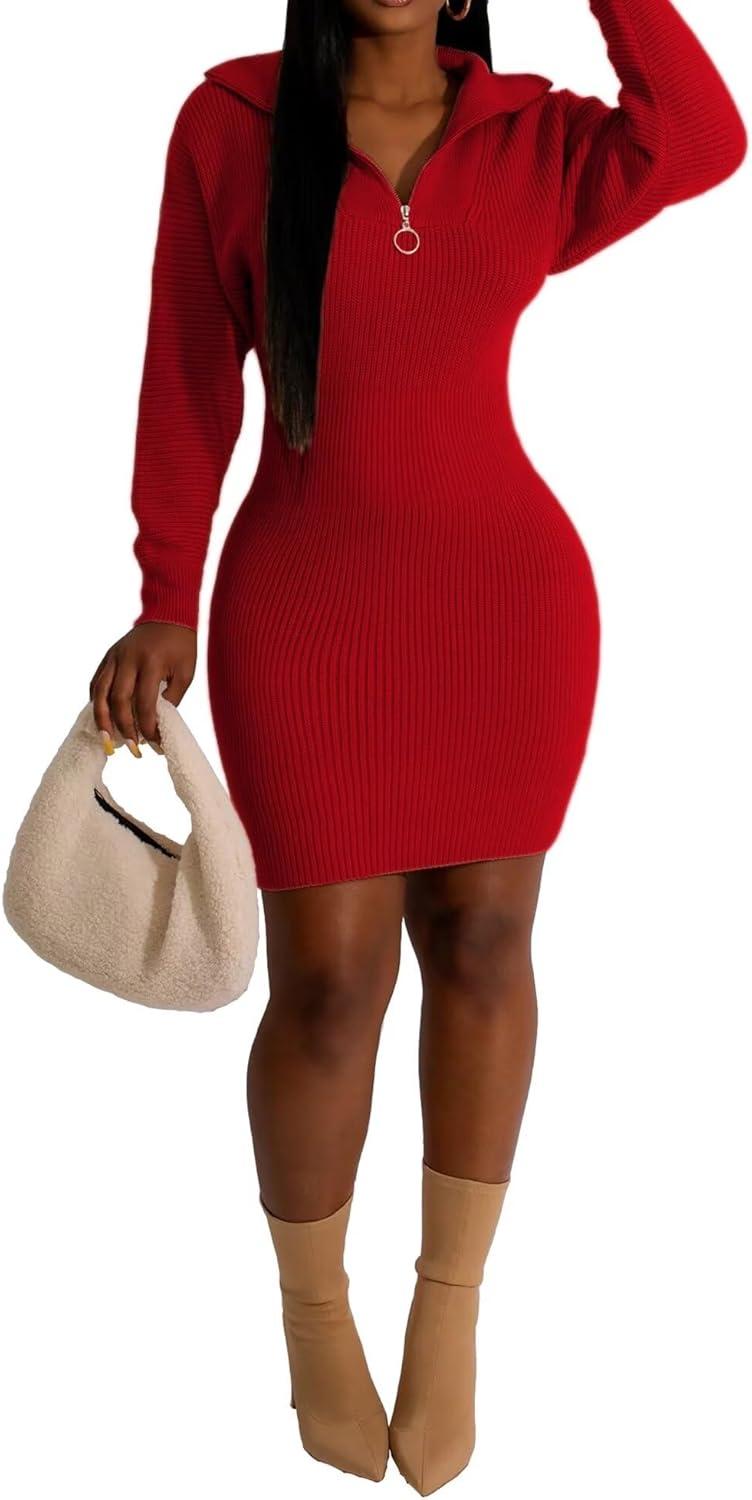 IyMoo Women’s 2025 V Neck Ribbed Long Sleeve Bodycon Pullover Cute Mini Sweater Dress(Red)