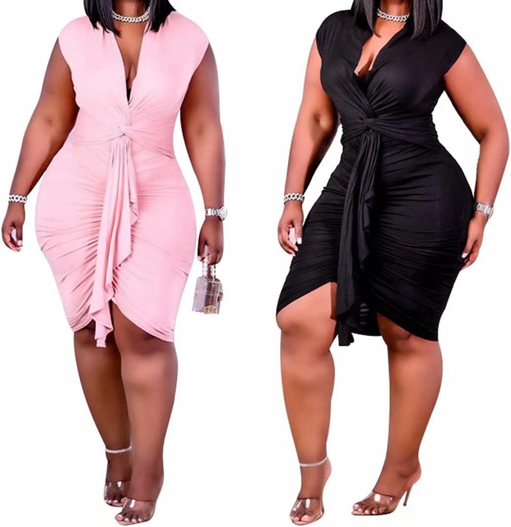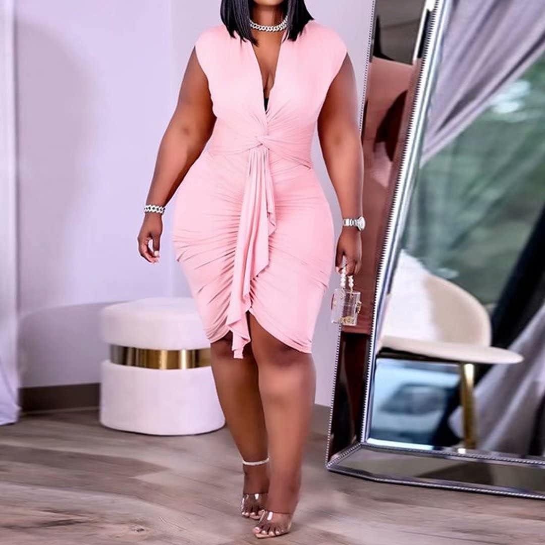 IyMoo Women's Sexy Plus Size Bodycon Sleeveless Drawstring Ruched Mini Club Dresses(Pink)