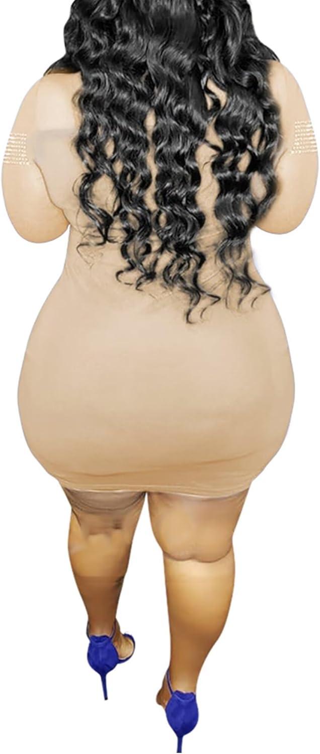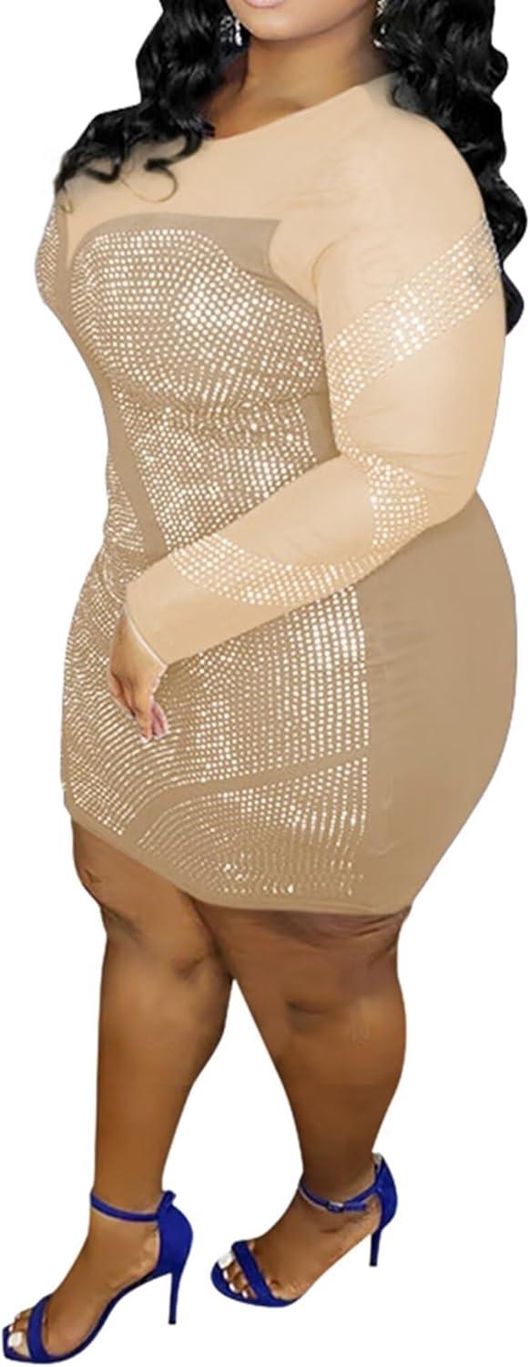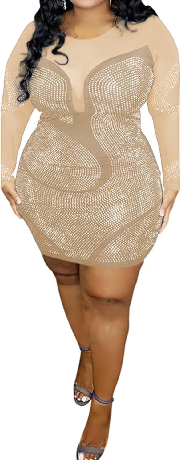 IyMoo Womens Sexy Plus Size Long Sleeve Rhinestone Mesh See Through Bodycon Party Club Mini Dress Clubwear(Beige)