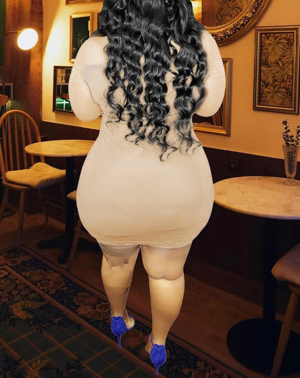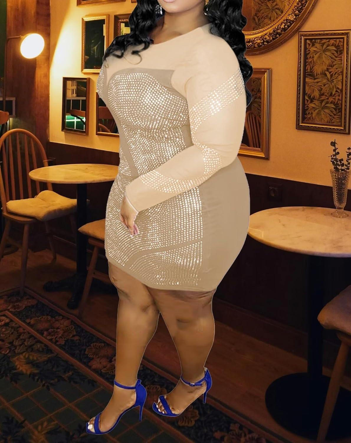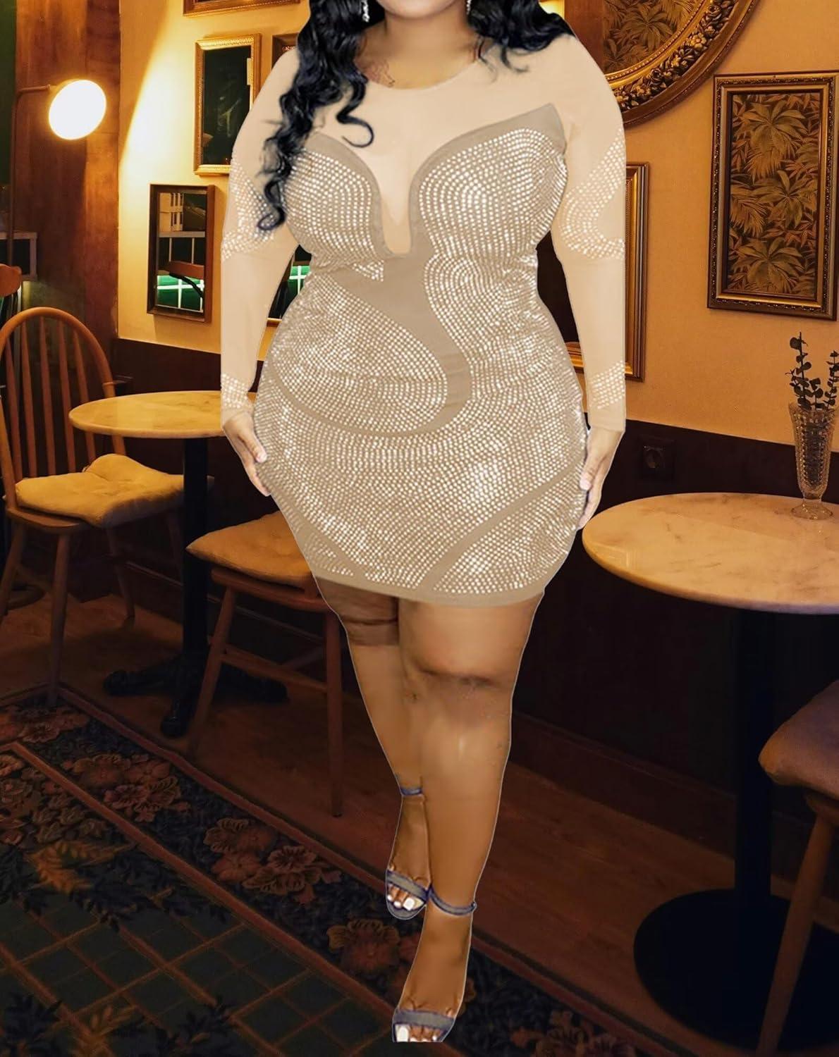 IyMoo Womens Sexy Plus Size Long Sleeve Rhinestone Mesh See Through Bodycon Party Club Mini Dress Clubwear(Beige)