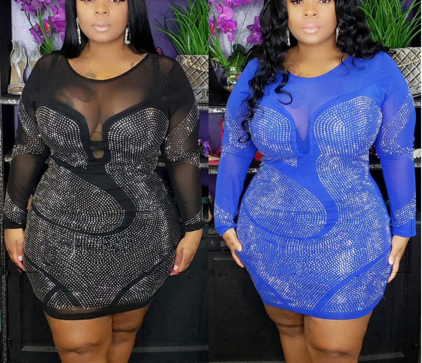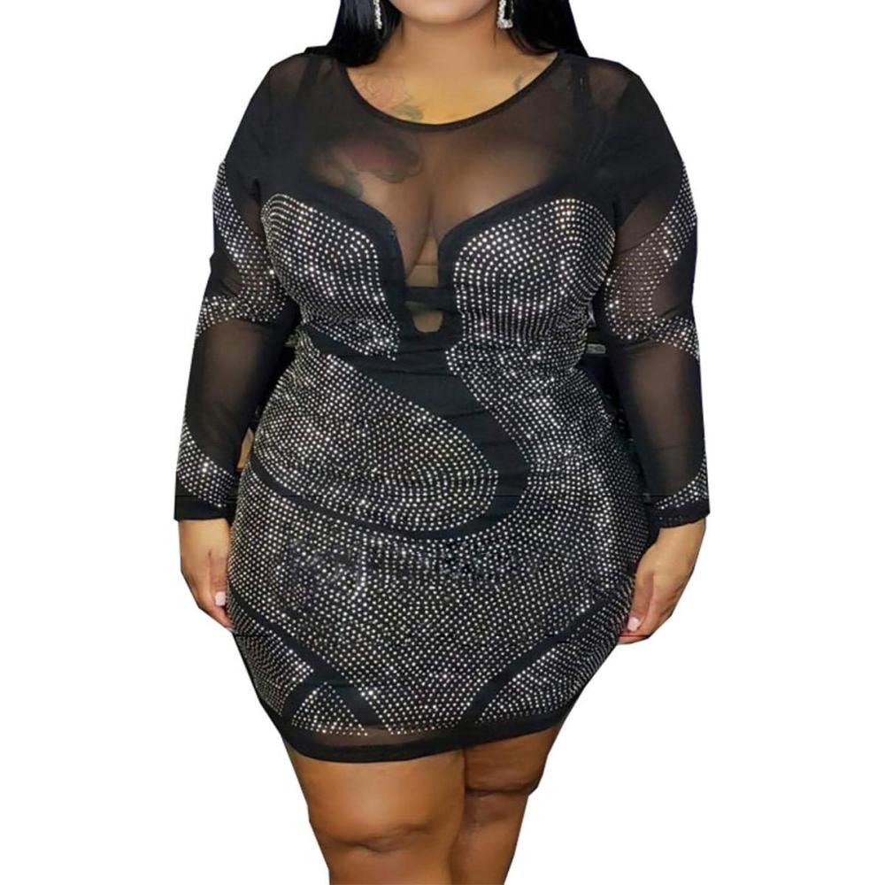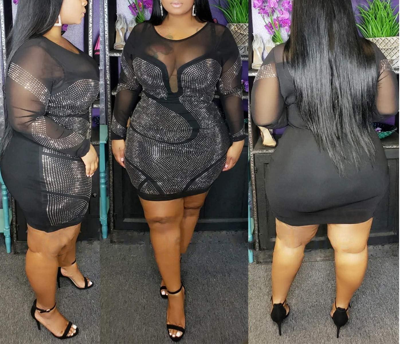 IyMoo Womens Sexy Plus Size Long Sleeve Rhinestone Mesh See Through Bodycon Party Club Mini Dress Clubwear(Black)