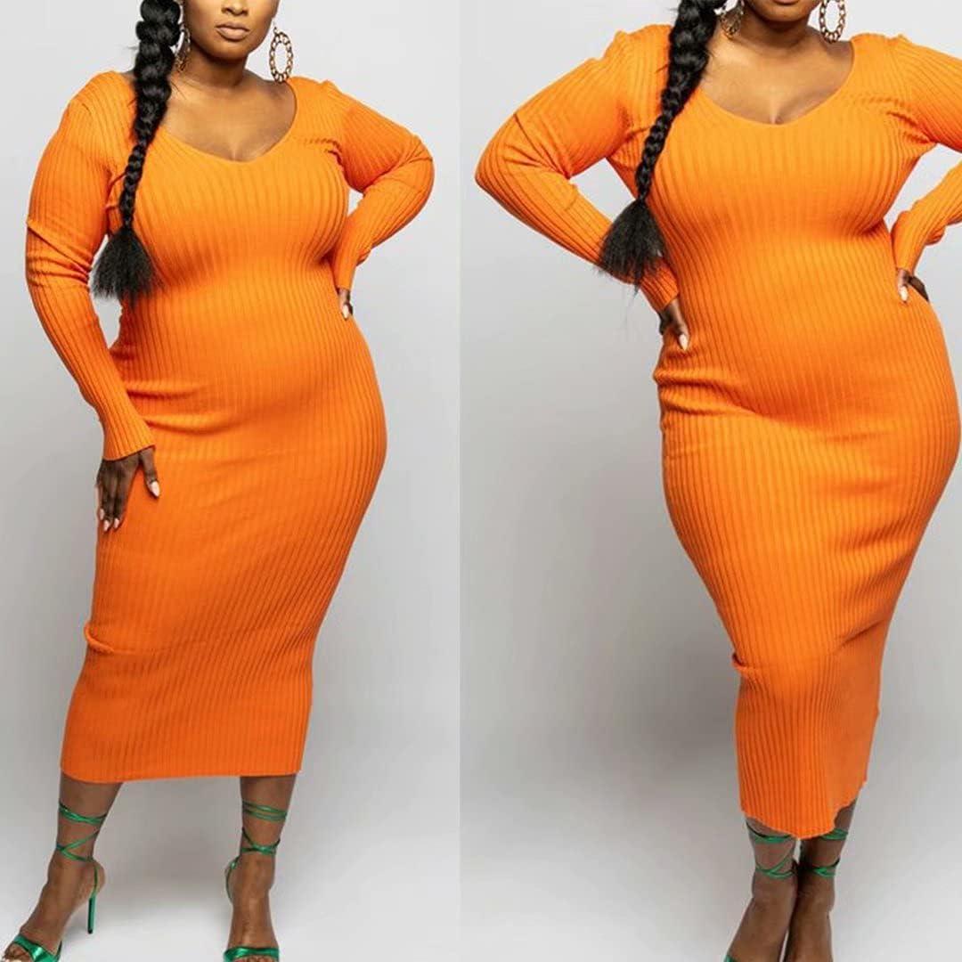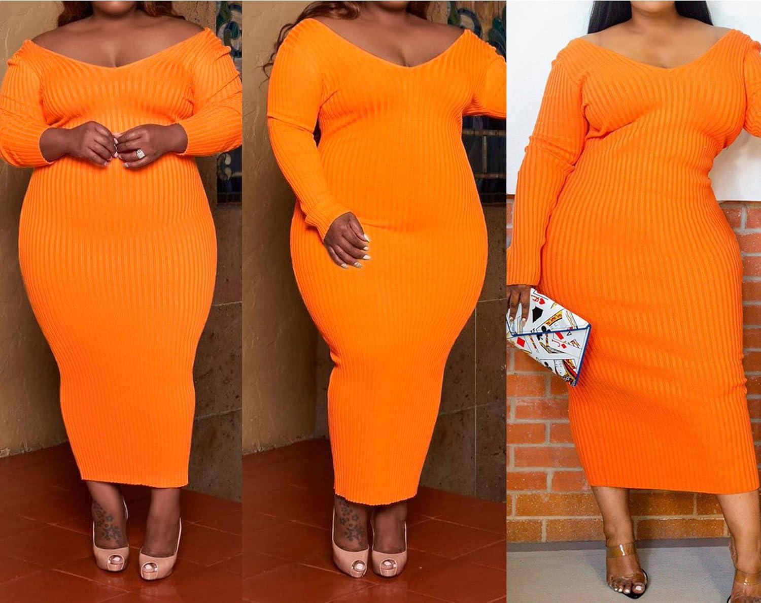 Women's Plus Size Sexy Stretchable Long Sleeve Maxi Sweater Off Shoulder Knit Slim Fit Dress(588 Orange)