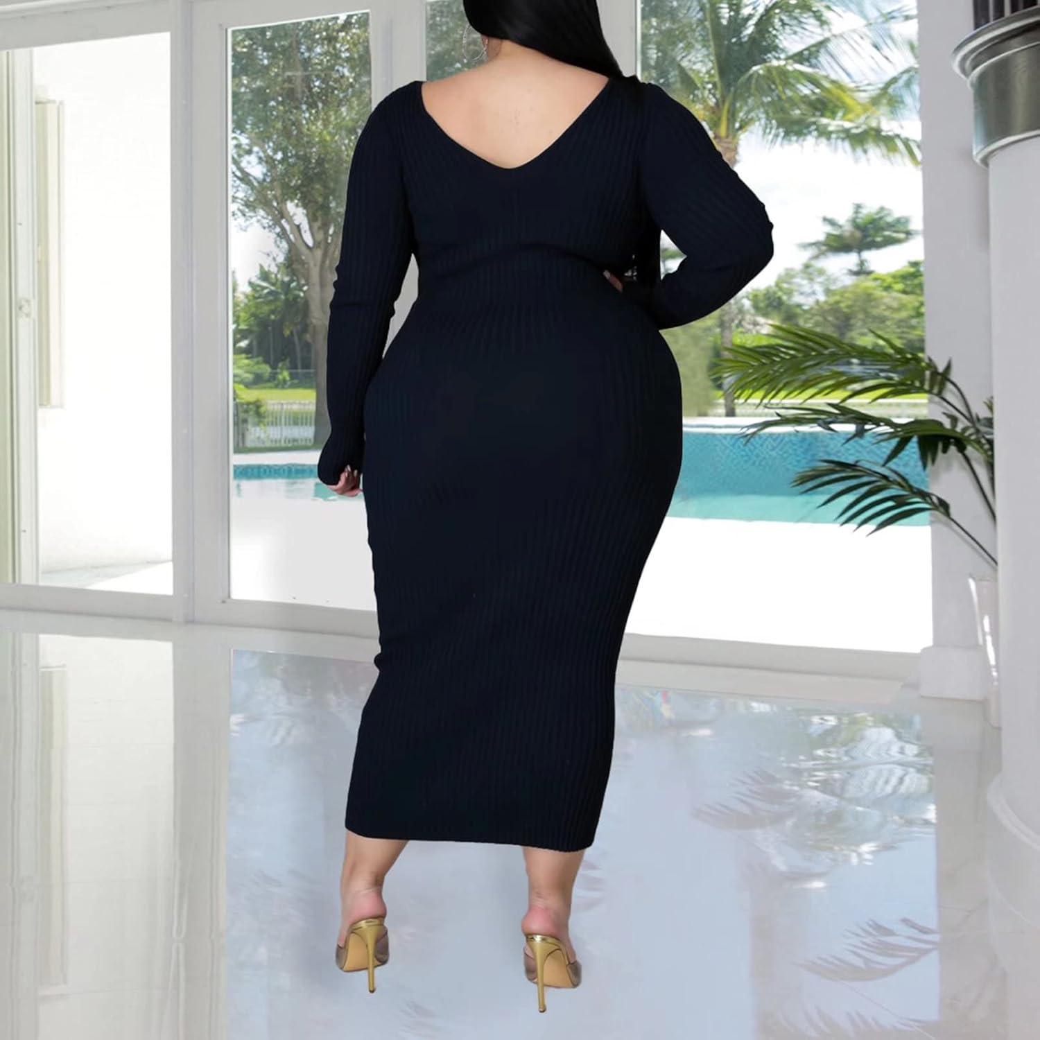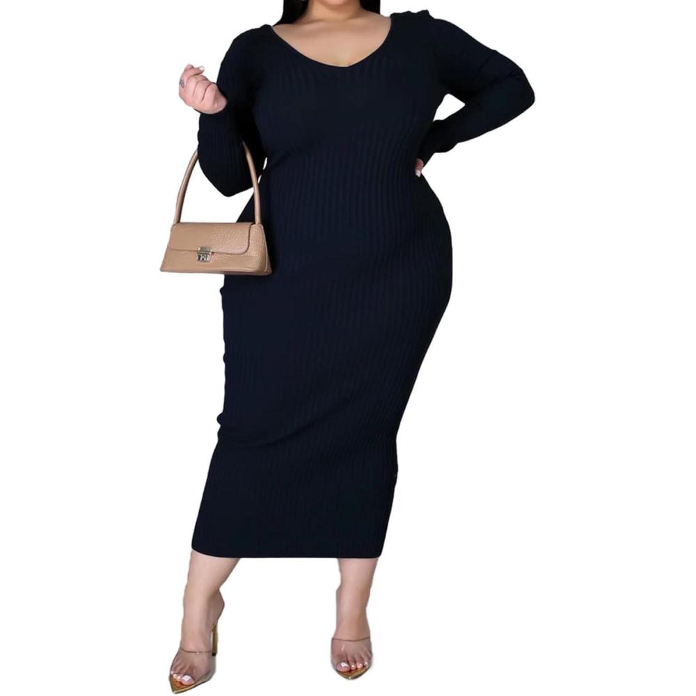 Women's Plus Size Sexy Stretchable Long Sleeve Maxi Sweater Off Shoulder Knit Slim Fit Dress(Navy Blue)
